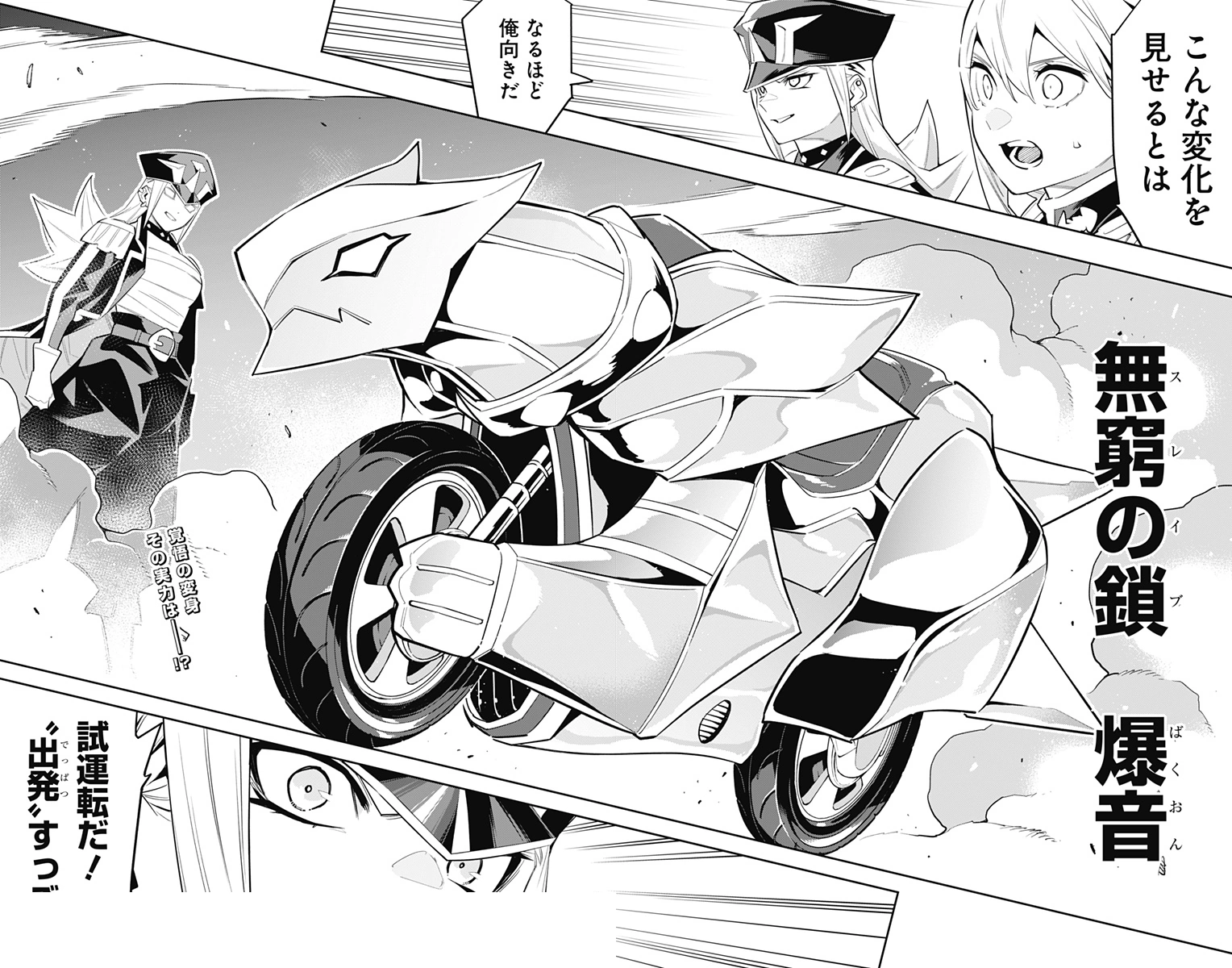 In this form, Yuuki resembles a motorcycle. His head becomes the front fairing and headlights, his forearms become the fork for the front wheel, and his legs transform into twin exhaust pipes.